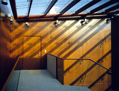 Die sehr präzis konstruierte, bräunlich-changierende Haut aus eloxierten Aluminium-Tafeln überzieht die Schmalseiten und die Längsfassade. Die Verglasungen sind bündig in diesen Metallvorhang eingesetzt, sodaß sich, vor allem im Gegenlicht, eine entmaterialisierende Reflexion, eine teilweise Auslöschung der Baumasse ergibt. Das stehende Glasfeld des im Drittelpunkt der Baukörperlänge eingeschnittenen Stiegenhauses und die durch vorgelegte Parapetverglasungen zusammengefaßten Bandfenster wachsen je nach Tageslicht zu einer veränderlich durchsichtigen Kreuzfigur zusammen.
