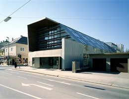 Da die Wahrung aller Rechtsansprüche an diesem Bauplatz nur mehr einen kleinen Neubau zugelassen hätte, mußte er als Umbau unter Wahrung einiger Fundamente und Mauerteile vorgenommen werden. Die Eingangssituation der erdgeschoßigen Geschäftsfläche repetiert jene des Kinos, mancher tragende Pfeiler ist geradezu rekonstruiert, um in den Genuß der alten Baulinien zu kommen. Der Baukörper ist somit in Grund- und Aufriß eine ausgereizte Maximalfigur, der aber trotzdem keine spekulativen Motive anzumerken sind. Im Gegenteil: Selten hat ein Bauherr in der Provinz so dezidiert gegen das Stadtländliche, also gegen eine rasche Marktakzeptanz und gegen den Populargeschmack angebaut.