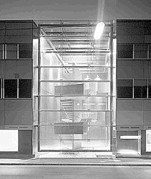 Der Bau stellt sich sehr selbstbewußt als trickreich geglätteter, ruhiger, aber in seiner Fremdheit spannungsgeladener Block mit fünfzig Metern Länge, vierzehn Metern Tiefe und drei Geschoßen dar. Er besetzt das Eck ostentativ, radikalisiert es mit einer vorgezogenen Wand und einem Kragdach. In Fortschreibung der gegebenen Baulinien nehmen die vier Fassaden zum Stadtraum unterschiedlich Stellung. Nach Osten, am Entree zum Erdgeschoßlokal, offeriert Kelz eine bergende, auch einladende Geste. Die großzügige Verglasung der beiden Obergeschoße ist durch ein feststehendes Lamellensystem gegliedert. Die kongruenten Neigungen - aufgehend, zugehend - jeweils zweier, stählerner Flügel wollen das Thema der verlorenen Kinoprojektion mit dem des Tageslichteinfalls verbinden.