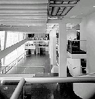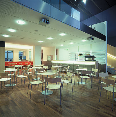 Der Bauplatz selbst ist sozusagen ein Hoffnungsgebiet für Siemens: Denn man muß damit rechnen, daß sich in absehbarer Zeit einmal Büroetagen über der kleinen Veranstaltungskiste türmen. Trotzdem hat es Lindner geschafft, die Vorgabe einer Stützenreihe, von der dann links und rechts Büros erschlossen sind, konstruktiv so weit zu umgehen, daß zwar eine Überbauung des Hauses auch weiterhin möglich ist, der neue Veranstaltungsbau aber trotzdem räumlich völlig freigespielt bleibt.
