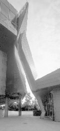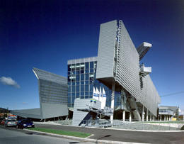 Nun ist die vollkommenste Bauskulptur in der Regel nicht zweckfrei, sondern muß bestimmte Anforderungen an Funktionalität erfüllen. Thom Mayne postuliert „function follows form“ und begründet schlüssig, dass sich die Funktionen stetig ändern und Anforderungen kein feststehendes Etwas sind. Sein Interesse liegt nicht in unmittelbarer Funktionserfüllung, vielmehr sieht er sein architektonisches Operationsfeld durch Termini wie Veränderung, Widersprüchlichkeit, Konflikt und Dynamik geprägt, die für ihn kennzeichnend für die gleichermaßen komplexen wie fragmentarischen Strukturen der Gesellschaft im ausgehenden 20.Jahrhundert sind. Und er scheint an unorthodoxen Räumen interessiert, die diese Dissonanz ausdrücken. Die Schalterhalle im Kundencenter spiegelt dies wider. Den erweiterten technischen Möglichkeiten unserer vernetzten Welt entsprechend könnte sie auf die Grösse eines Computerterminals reduziert sein. Die Architektur reagiert darauf, indem sie die Schalterhalle reduziert auf einen minimalen Servicebereich und die Schalter mit einer irritierend niedrigen Decke versieht. In den Bürobereichen allerdings bleibt der Architekt in einem erschreckenden Maß in hierarchischen Strukturen stecken. Das oberste Geschoß, die Vorstandsetage erweist sich, zumindest in den nach Süden orientierten Räumen als Bel Etage mit hohen, von allen Seiten durchsonnten Räumen. Die nach Norden gerichteten Büros aller Geschoße sind unterbelichtet und müssen tagsüber immer Kunstlicht zuschalten, weil sie einer rigiden formalen Entwurfsidee unterworfen sind. Ihre Fenster, liegende Elemente in der gleichen Form und Grösse wie die im Abstand davorgesetzten Klappen in der durchgehenden Lochblechhülle sind, ganz banal, einfach zu klein. Der Ausgewogenheit der Fassade und der Rythmik ihrer Öffnungen hätte es sicher nicht geschadet, wenn die hinter den Klappen liegenden Fensteröffnungen größer ausgefallen wären.