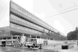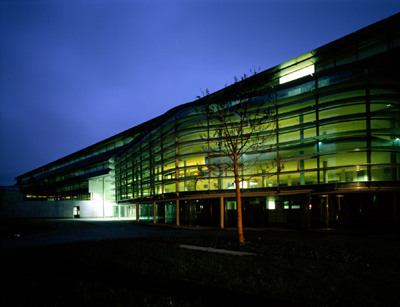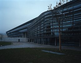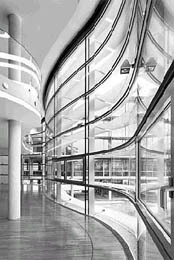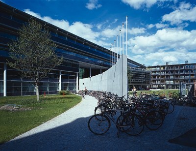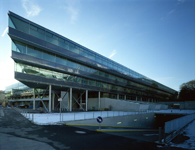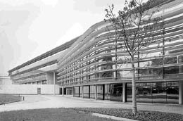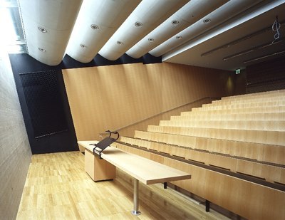 Das heißt nun nicht, daß die unteren Geschoße weniger attraktiv wären, denn hier sind die publikumsintensiveren Räume, die Hörsäle, die Mensa mit Café, die räumlich spannungsvolle Bibliothek sowie großflächige Computerarbeitsräume, angeordnet. Die Bibliothek, die, südseitig von Lamellen beschattet, aus dem Baukörper hinausdrängt, reicht andererseits durch das ganze Bauwerk hindurch, die zugehörigen Büros blicken nach Norden.