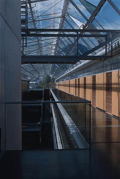 Wenn man den Windfangzylinder mit Drehtür durchschritten hat, befindet man sich in dem lichten Binnenraum zwischen den Längstrakten. Kaskadenartig, in vier Läufen, steigt eine Treppe längs gegen Westen unter dem Glasdach bis zum obersten Geschoß hinauf, zu ihrer Linken bleiben jeweils offene terrassenartige Raumzonen für den kurzen Aufenthalt. Schon beim Hinaufsteigen ist die Raumwahrnehmung sehr intensiv, bis dann auf der obersten Plattform der Panoramablick seitlich durch das Glasdach auf die Nordkette fällt und den kategoriellen Sprung vom Binnenraum der Halle zu dem von den Bergketten nachhaltig gefaßten Landschaftsraum des Inntals provoziert. – Die Konzeption des großen Innenraums erfolgte wie selbstverständlich im Wissen um den größeren Zusammenhang der stark präsenten Talflanken.