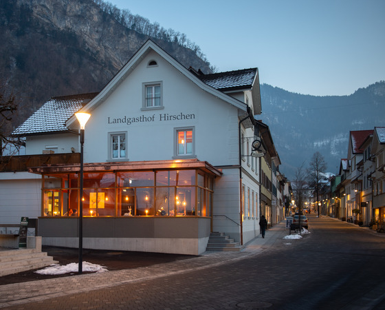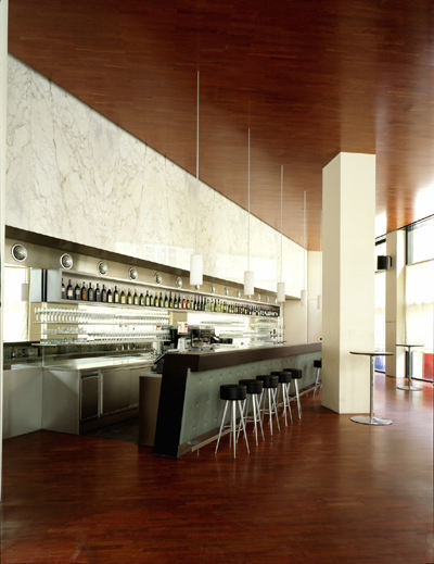 Im tageszeitlichen Wechsel ändert das Licht seine Dominanz und der Raum seine Richtung: Tagsüber ist er von der durch die großen Verglasungen eindringenden Stadt bestimmt, abends vom luziden Vorhang aus italienischem, mit berückender Zeichnung die Aufmerksamkeit auf sich ziehendem Marmor.