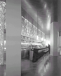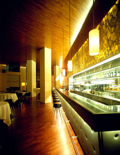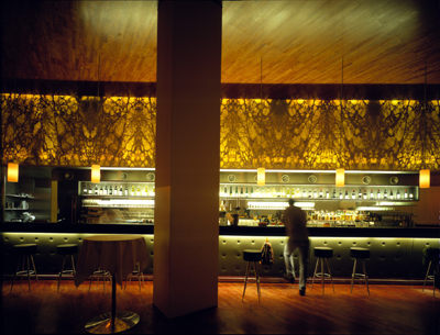 Claudia König und Werner Larch, aus Vorarlberg stammend, in Wien ausgebildet und arbeitend, auch schon an mehreren realisierten Projekten erfahren, nutzen das Potential des Ecklokals trefflich. Um die fast widersprüchlichen Voraussetzungen für kulinarischen Genuß im Restaurant mit denen für den alltäglichen Umgang im Café und an der Bar zu vereinen, setzen sie auf einen großzügige Halle, die in fließend ineinander übergehende funktionale Zonen gegliedert ist. - Das Mietwohnhaus an der Ecke Laudon- und Daungasse, ein um 1905 errichteter, für diese Zeit technisch beeindruckender Stahlbetonbau mit vier Stöcken, bietet im Erdgeschoß einen stützenarmen Raum, dessen Qualitäten zuvor durch die massiven Ausfachungen im Skelett nicht erkennbar sind. Das vorher darin befindliche Rotlichtlokal war zuvor mehr auf hermetische Abschließung, denn auf Öffnung zur Straße bedacht.