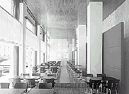 Aus dem Windfang austretend, fällt der Blick auf die in die Tiefe des Raumes leitende Bar; auch von dort zurückblickend ergibt sich durch die spitzen Winkel zwischen Theke und Mittelstützen beziehungsweise Außenwand eine beeindruckende Perspektive. Die mit 25 Metern erhebliche Längserstreckung des mit differenziert gewählten Tischen und Sesseln bestückten Café- und Restaurantbereiches verfehlt ihre Wirkung auch bei gutem Besuch nicht.