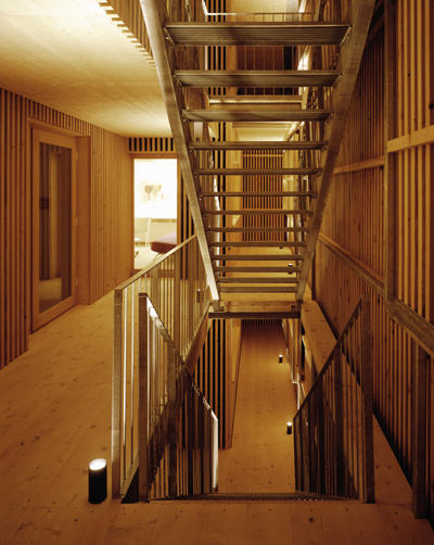 Die Einheitlichkeit des warm anmutenden Holzes überspielt die Fülle der Nutzungen und die geometrischen Zwänge mit Selbstverständlichkeit, die bewußt nach Nutzungssituationen variierte Möblierung wächst zusammen. Es ist evident, daß die Entwerfer versuchen, wenige Grundideen konsequent und ostentativ umzusetzen und die unvermeidlichen Detailprobleme gestalterisch abzumagern. Konstitutiv für die innenräumliche Präsenz des „Dennstedt“ ist der Umgang mit Licht. Tag- und Nachtwirkungen werden klar unterschieden.