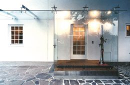 Die tragenden Elemente bilden dabei zwei Dreischicht-Glasstützen beziehungsweise -Glasbalken, die durch einfache Zapfenverbindungen miteinander befestigt sind und allen anderen lediglich geklebten Glasteilen den nötigen Halt geben. Als vertikale Aussteifung dienen vier sogenannte Glasschwerte, um die Windlasten abtragen zu können. Gefertigt wurde aus laminiertem Isolierglas mit erhöhter Sonnenschutzfunktion, die Dachfläche ist zwecks Beschattung 40prozentig punktgerastert. Auch bei der großdimensionierten, rahmenlosen Terrassentür wurde der Weg der technischen Herausforderung beschritten.