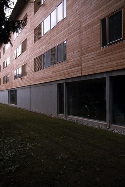 Wo steckt in diesem Bau nun der versprochene Fortschritt? Ein wesentlicher Punkt ist die Art, wie Hubert Rieß sich den geänderten ökonomischen Rahmenbedingungen des Bauens gestellt hat. Nach seinen Arbeiten in Bayern, die noch alle unter eher experimentellen Vorzeichen standen, wollte er hier den Holzsystembau in die Normalität des Bauens hineinholen. Das Motiv, unbedingt billiger sein zu müssen als der Massivbau, hat ihn dabei nicht mehr interessiert. Der Bau ist nicht teurer, aber auch nicht billiger als das, was im sozialen Wohnbau heute als vertretbar gilt: Die Kosten lagen (ohne Baugrundanteil) bei 16.500 Schilling (1187 Euro) pro Quadratmeter inklusive Honorare und Mehrwertsteuer.