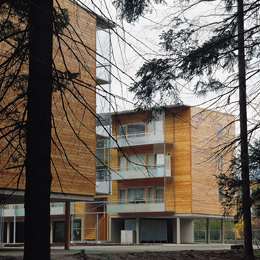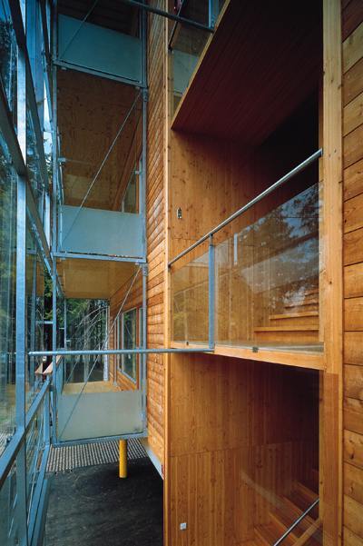 Bemerkenswert ist an diesem Gebäude vieles, was nicht sichtbar ist: Die drei oberen Stockwerke sind nicht nur mit Holz verkleidet, sondern aus Großtafeln in Holzkonstruktion zusammengesetzt, die in der Fabrik vorgefertigt wurden. Die Decken sind Brettstapeldecken, also massive Decken aus dicht aneinandergesetzten Brettern, die hier in Kombination mit einem Estrich Schalldämmwerte ergeben, die die vorgeschriebenen Normen weit übertreffen. Die Treppen sind massive Eichentreppen, die ebenfalls in der Fabrik gefertigt und dann in wenigen Stunden per Kran versetzt wurden.