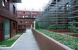 Als Trennung zwischen den einzelnen Gärten beziehungsweise Terrassen hat Nouvel ein Element entwickelt, das den Charakter der Siedlung wesentlich bestimmt: meterhohe Rankgerüste aus Stahl, die im jetzt noch unbepflanzten Zustand eher an ein Umspannwerk erinnern, aber im Lauf der Zeit zu grünen Wänden werden sollen. Im Zusammenhang mit diesem Element muß auch die Wahl der dominierenden Gebäudefarbe gesehen werden: Alle Außenwände sind in einem dunklen Weinrot gestrichen, die Betontröge vor den Wohnungen ebenso wie die Holzverschalung der Fassade und die Verblechung des Dachs und der Gesimse. Das dunkle, erdige Rot gibt dem an sich schon gedrungenen Baukörper zusätzliche Schwere, vor der die Bepflanzung umso stärker zur Wirkung kommen wird.