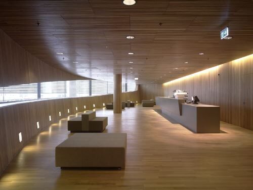 Inside, the almost narrative nature of the building is highlighted by the singularity of each space, which is achieved with different colours, materials and texture. The entrance contrasts with the intimate character of the mezzanine floor, which in turn contrasts with the exuberant use of colour in the office areas. The auditorium is designed as a single unit – a concrete shell that embraces stage and pit in an uninterrupted trajectory. Yet within this diversity there is unity and interdependency between the spaces.