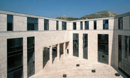 In their competition design, the architects proposed cladding the facade with stone from the local quarry. That idea fell through when the stone proved not to meet the required quality standards. However, locally-quarried gravel has been used as ballast on the flat roof, so that from the hilltop the building does have a solid, rock-like presence. Travertine – imported from Turkey in view of the highly competitive price – has now been used for the cladding and the floors. Unfortunately, for financial reasons, the contractor and the client opted for open joints. The architects would have preferred closed joints which would have given the building a more solid appearance.