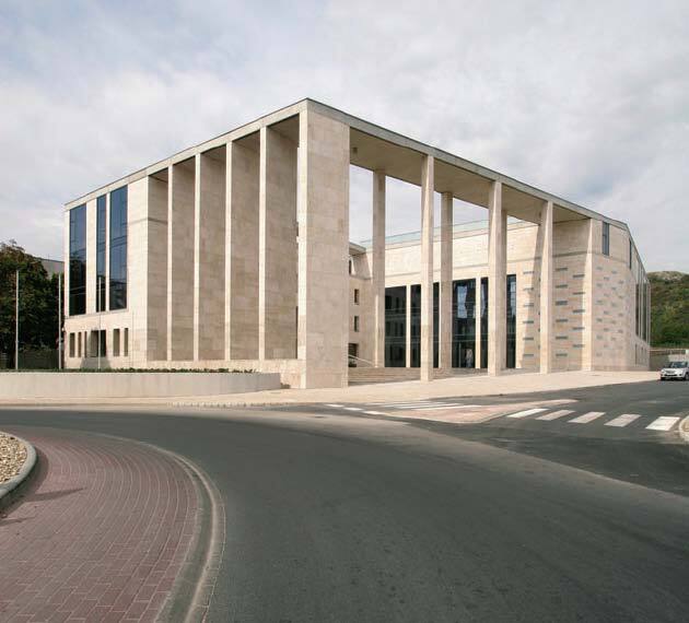 In their competition design, the architects proposed cladding the facade with stone from the local quarry. That idea fell through when the stone proved not to meet the required quality standards. However, locally-quarried gravel has been used as ballast on the flat roof, so that from the hilltop the building does have a solid, rock-like presence. Travertine – imported from Turkey in view of the highly competitive price – has now been used for the cladding and the floors. Unfortunately, for financial reasons, the contractor and the client opted for open joints. The architects would have preferred closed joints which would have given the building a more solid appearance.