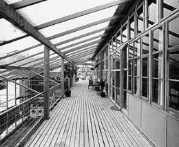 Ein Kuriosum wäre noch zu erwähnen: Im obersten Geschoß sind an beiden Enden des langen Wohnbaus die Dachflächen abgeschrägt. Diese Schräge wurde von Richter ebenfalls verglast und ebenfalls mit dem innenliegenden Sonnenschutz ausgestattet. Sie resultiert daraus, daß es nur einen einzigen Lift zur Erschließung der 170 Meter Länge dieses Wohnbaus gibt. Was – nach irgendwelchen und nur schwer nachvollziehbaren Kriterien der Wiener Bauordnung – zu weit vom Lift entfernt lag, mußte den Charakter einer ausgebauten Dachwohnung haben. Daher die Dachschräge, die allerdings unter einem verblechten Dach klimatisch noch viel problematischer gewesen wäre, als das jetzt der Fall ist.