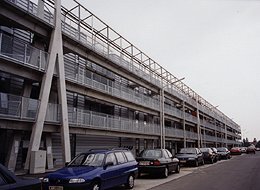 Der Eindruck, den der Wohnbau von Helmut Richter auf den ersten Blick vermittelt, ist der von Länge und Tempo – das Haus „pfeift “unglaublich sympathisch dahin –,und er löst ein, was man an Ansprüchen in dieser Lage anmelden muß. Man betritt die Wohnungen von Norden, Stiegenhäuser und Lift sind durch eine leuchtend rote Kunststoffplane – wie im ersten „Kiang “von Richter – ausgewiesen, sie sorgen für eine Rhythmisierung des langen Riegels.