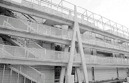 Bemerkenswert ist vor allem die konstruktive Lösung: Das Haus „hängt “am Laubengang, der mit seinen wenigen Stützen – Richter nennt sie „A-Böcke “– die tragende Rolle spielt. Das ist insofern ungewöhnlich, als sich die tragende Konstruktion nur auf einer Seite – im Norden – befindet und die Aussteifung des Gebäudes über sogenannte „Querkraftdornen “bewerkstelligt wird. Beim Fassadenaufbau – der besonders nach Süden überraschend viele Glasflächen umfaßt – hat Richter das gleiche System verwendet wie bei seinem Wiener Schulbau. Er hat die Trockenbauweise dem massiven (Ziegel-)Mauerwerksbau ja schon immer vorgezogen, und die Domico-Paneele bieten die Möglichkeit zu einem sauberen, raschen und ökonomischen Fassadenaufbau, und mit ihrer Aluminiumoberfläche entsprechen sie obendrein den heutigen Anforderungen der Nachhaltigkeit.