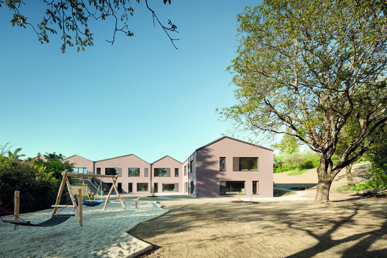 Natürlich sind jeder Gruppe Freibereiche zugeordnet, natürlich sind alle Gruppenräume „maßstabgerecht“interpretiert, also auch für die kindliche Perspektive zugeschnitten. Und natürlich ist in den Innenräumen eine Einheitlichkeit des Materials durchgehalten, die den Eindruck von Großzügigkeit vermittelt. Kein unnötiges Detail, keinerlei Zierat – aber ein reizvolles Spiel mit Baukörpern, mit Transparenz und Geschlossenheit, mit Oberflächen und Farben, mit Blickwinkeln.