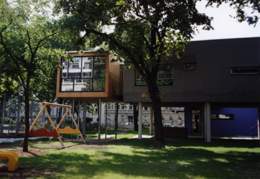 Die Organisation ist pragmatisch: Es gibt eine Art Servicezone über die volle Länge des Hauses, und der angelagert sind die verschiedenen Gruppenräume. Die haben alle den gleichen räumlichen Zuschnitt, Einbauten in Holz, einen grünen Gummiboden – und viel, viel Glas. Und das ist so eingesetzt, daß es den Kindern entspricht: Schließlich sollen die durch- und hinaussehen. Und zwar sehr wortwörtlich. Es gibt nämlich im Obergeschoß auch ein räumliches Apercu, das sozusagen unnütz ist. Die Architekten nennen es: die Rache der Kinder. In Architektur übersetzt bedeutet das: einen rundum verglasten Erker, der den Kindern die nicht ganz alltägliche Perspektive von oben nach unten – und nicht umgekehrt – ermöglicht.