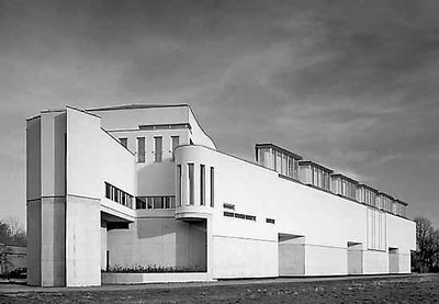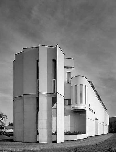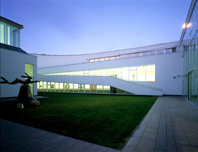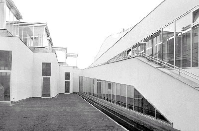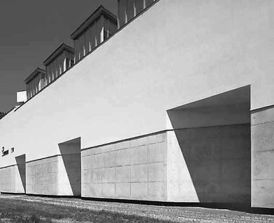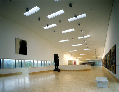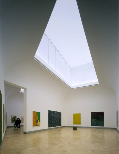 Das neue Museum des Architekten Heinz Tesar steht in Klosterneuburg parallel zur Wienerstrasse am Beginn der Donauauen seitlich zu Füssen des imposanten barocken Stifts. Tesars Museum ist ebenfalls ein massiger Imponierbau: über einem Sichtbetonsockel folgt das weiss verputzte Galeriegeschoss, bekrönt von der schräg gesetzten Staffel der gläsernen Oberlichter. Der Grundriss ist keilförmig. Dass die Saalflucht im Innern senkrecht zur Rückwand steht, ist von vorn nur an der Stellung der Oberlichter ablesbar. Die wenig gegliederte Hauptfassade ist auf Frontalität konzipiert. Im Erdgeschoss befindet sich eines der weltweit grössten Bilderdepots. Im ersten Stock liegen die grosszügigen Oberlichtsäle, ein begrünter Innenhof und rückwärts weitere Sammlungsräume, die seitlich Tageslicht empfangen. Der donauseitige Flügel wird durch einen zylindrischen Saal und eine Treppenanlage akzentuiert, die einen weiteren grossen Ausstellungssaal im zweiten Geschoss erschliesst. Sucht die Frontseite mit ihren Oberlichtern den Bezug zu den Klosterkuppeln, so passt sich der Trakt mit seinem «frei schwebenden Dach in Form einer Welle» der Donau an.