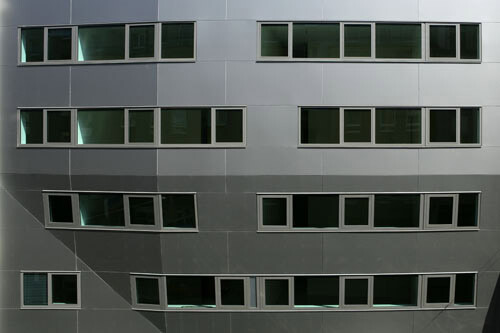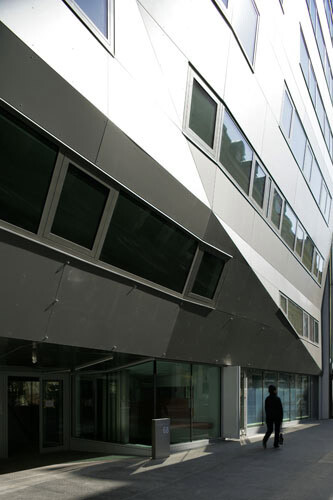 In den stromlinienförmigen Alucubond-Platten der westlichen Straßenfront scheinen sich die City Vibes zu materialisieren. Die schillernde, geknickte Raumfaltung mit zartgefassten Fensterbändern wird zur Visitkarte der weltoffenen Klientel. Den Wohnungen schenkt die bauchig vorgeneigte, schiefwandige Fassade spannende Räume, breite, ansteigende Fensterbrüstungen animieren zum Be-Sitzen. Im verglasten Erdgeschoss wird ein Büro einziehen, daneben leuchtet der orange, aerodynamisch mit praktischem Ablagearm gestylte Briefkasten durchs transparente Foyer. Das Edelstahlgittergeflecht im Stiegenhaus lässt an Haute-Couture- Spitze denken, ahnungsvoll hell blitzt es durch den verglasten Eingang auf die verkehrsreiche Straße.