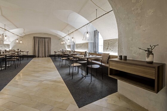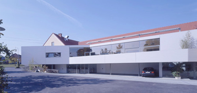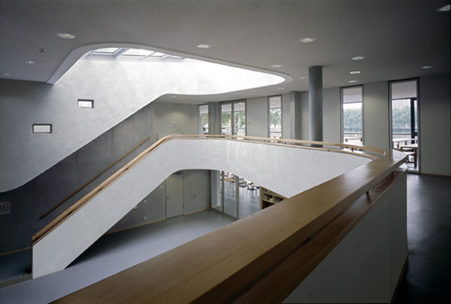 Im Inneren ist das zweigeschossige Foyer mit seinem Luftraum und dem großen Oberlicht das Zentrum des Hauses, von dem aus die Gästezimmer und die gemeinschaftlichen Bereiche erschlossen werden. Der angrenzende Innenhof belichtet Tagungsräume im Altbau und das Foyer. Über ihn wird auch – neben dem Austritt im 2.Obergeschoss – die Dachterrasse erschlossen. Die beiden unteren Geschosse und das 2.Obergeschoss des Neubaus nehmen die gemeinschaftlichen Nutzungen wie Foyer, Bistro, Speisesaal und Tagungsräume auf. Darüber liegen die Gästezimmer als Zwei- und Vierbett-Zimmer mit jeweils eigener Dusche und WC.