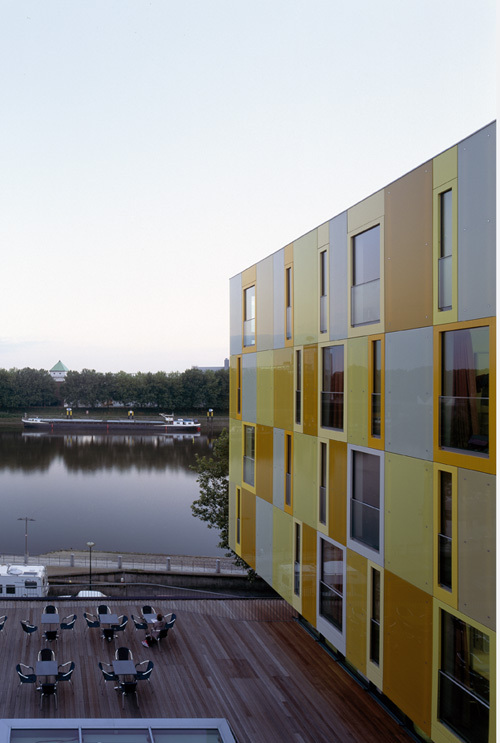 Das Ensemble aus Neu- und Altbau ist als eine Komposition von drei Baukörpern aufgefasst. Durch die Verkleidung der aufgeständerten Volumina mit farbigem Glas und Alucobond – einer Verbundplatte bestehend aus zwei Aluminium-Deckblechen und einem Kunststoff- oder mineralischen Kern – wirkt die neue Jugendherberge weit in den Stadtraum hinein. Die Farbigkeit lässt den Baukörper zum Signal werden, ähnlich den Schifffahrtszeichen, die im Fluss stehen. Die auberginefarbene Box des 1.Obergeschosses hat ein großes Panoramafenster zur Weser. Die spiegelnde Untersicht – ebenfalls in Alucobond – verdoppelt die Passanten in die Vertikale. Der aufragende gelbe Baukörper, der die Zimmer beherbergt, wurde möglichst bündig entwickelt. Die Ansichtskanten der Geschossdecken sind in der Fassade nicht ablesbar. Die geschosshohen Fenster besitzen farbig lackierte Blendrahmen aus Aluminium, die ebenenbündig mit den punktgehaltenen Gläsern der Wandverkleidung sitzen. Glasbrüstungen ermöglichen es, die Fenster als französische Fenster vollständig zu öffnen.
