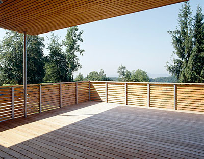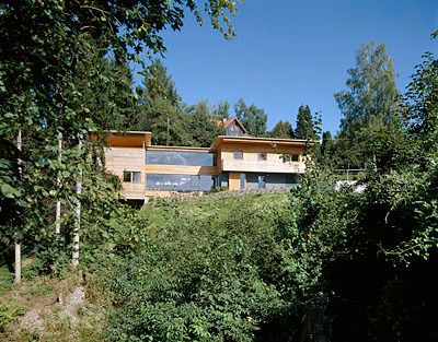 Abschluss der funktionell klar gegliederten Holz-BauKörperformation bildet der Pool, der sich im Nordwesten in den Hang schmiegt. Eine Stiege führt vom Wasser auf ein Terrassenplateau an der Glastür beim Esspodest, das auf einer Ebene in den hangwärts offenen Gang mit der Treppe gleitet. Sie verbindet und erschließt beide Hausteile und machte im Altbau unten einem großzügigen Entree und oben zwei geräumigen Bädern Platz. An der durchgehenden Terrasse im Südosten liegen das bauherrliche Schlafzimmer und die Garçonnière: ein großzügiger Wohnraum mit Miniküche und Schiebetür zur Bettstatt.