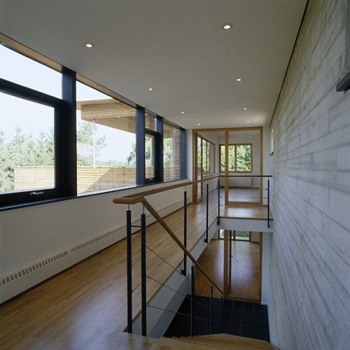 Im Erdgeschoß an der Nordrückwand ist die offene, zweizeilige Küche, über deren Bar man auf den Tisch für zehn Personen blickt, zwei Stufen darunter liegt der Wohnbereich an der über den Hang auskragenden Terrasse. Der Niveausprung schafft dem Diaprojektor die Idealhöhe zur Projektion an die Mittelwand zwischen zwei verglasten Raumecken und dem offenen Einraum eine klare Zäsur zwischen Essen und Wohnen. Dem Studio darüber mit dem ausladenden Vordach auf zwei zarten Säulen schenkt die Wohnraumdecke eine Terrasse mit Höhenpanorama.