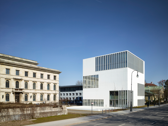 Die Oberfläche der Fassade zieht sich wie ein Leitmotiv durchs Gebäude. Die Stahlbleche, die den Eingang von Verwaltung und Anlieferung verkleiden, haben ihre gewellte Form direkt von der rauen Oberfläche des Betons: ein Bleichblech wurde mit einem Hammer in der Art einer Frottage abgedrückt, eingescannt und gefräst. Das Panel, das man so gewonnen hat, kehrt im Auditorium, das für wissenschaftliche Vorträge bereitsteht, als Wandverkleidung wieder, die mit der violetten Bestuhlung eine aparte Atmosphäre schafft. Die beiden Fensterbänder fressen sich wie millionenfach vergrösserte Risse durch den Beton der Fassade und legen sich mit ihren Stegen und Wellungen dem Blick von innen wie eigene Landschaften vor die Umgebung; technisch wurde ein kleiner Kupferzylinder zusammengedrückt und in Beton abgerollt, die entstehende Form ist am Computer bearbeitet.