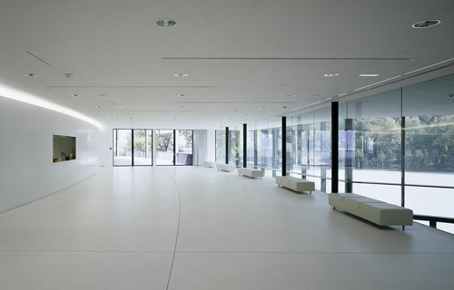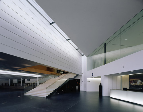 Das vielgliedrige Foyer dient allen Veranstaltungsstätten. Da die Raumhöhe, im zentralen Bereich, vom Rohbaubestand vorgegeben, eher knapp ist, sind Boden, Decke und die Wand zur Seetribüne hell, nahezu weiß gehalten. Räumliche Spannung erzeugen die dunkle, polygonale Rückwand des Saals und die flache Rundung gegenüber, hinter der sich die Seetribüne befindet. An solcherart schwierigen Raumkonfigurationen erweist sich die architektonische Sensibilität der Entwerfer, ging es doch nicht um ein Kaschieren, sondern um ein intelligentes Neuinterpretieren bestehender Rohbauteile.