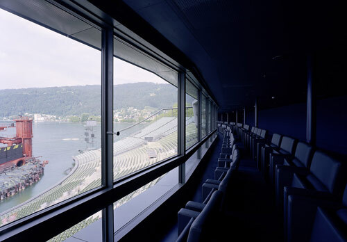 Nach Möglichkeit wurden Bezüge zum See geschaffen, um die attraktive Uferlage, wie etwa beim Seefoyer, einzubeziehen. Neu wurde zwei Geschoße über dem Foyer die Festspiellounge angeordnet, ein VIP-Bereich mit guter Sicht auf die Seebühne, dessen Fensterfronten sich unter die Decke hochziehen lassen, ohne dass Vertikalsprossen stehen bleiben. Von hier bietet sich nicht nur eine gute Übersicht auf Bühnenbild und Spielgeschehen, sondern auch auf den See. Darüber befindet sich die Regie für die Seebühne. Gemeinsam lassen die beiden zusätzlichen, Fassade bildenden Geschoße die Ansicht zum See höher werden, denn auch nach dieser Seite wollten die Architekten die Wirkung des Gebäudes verstärken.