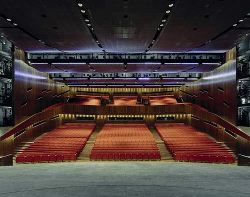 Kernstück war die Erneuerung des großen Saals mit dem Einbau eines Ranges zur Anhebung der Sitzplatzanzahl. Für die akustische Optimierung zeichnete der erfahrene Spezialist Karlheinz Müller aus München verantwortlich. Dabei galt es zu berücksichtigen, dass sowohl Opern als auch Sprechtheater und sogar Kongressveranstaltungen möglich sein müssen. Ein Parkettboden statt Teppich sowie die Vergrößerung des Hallraumes nach oben durch den Einbau eines zwar blick-, aber nicht schalldichten Metallgewebes an der Decke sind die sichtbaren Maßnahmen. Erneuert wurde aber auch die gesamte Bühnentechnik, und unter den Sitzplätzen wurden je einzelne Zuluftauslässe angeordnet. Die neuen, gepolsterten Sitze sind bequem und bieten auf allen Plätzen gute Sicht. Und in der Akustik gilt: Man hört, was man sieht. Vom Rang aus ist der übrige Zuschauerbereich nahezu weggeblendet, sodass der Bühnenausschnitt optisch näher rückt. Farblich dominiert das leuchtende Rot der Sitzpolster, das mit dem warmen Dunkelbraun der Robinie für Parkett und Seitenwände gut harmoniert. Die Furniere für die Wandpaneele stammen von verschiedenen Stämmen, sodass sich ein absichtsvoll lebendiges Bild ergibt.