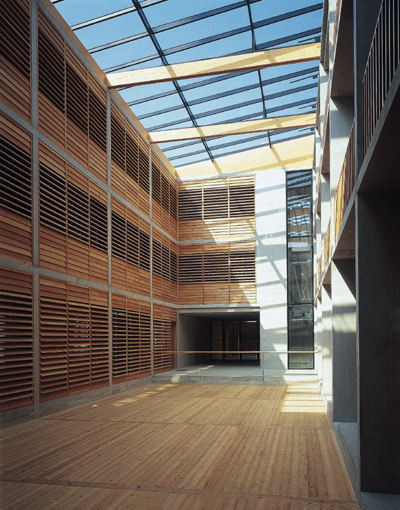 Das architektonische Herz des Hauses, das Atrium, wirkt durch die Ausrüstung in Sichtbeton und Lärchenholz spartanisch-feierlich. Der an drei Seiten umlaufende Kranz von Wohnungen ist durchgängig parallel zu den Fassaden zoniert, sodaß sich die in Modulen entworfenen Wohneinheiten beliebig koppeln lassen.