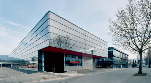Ein wenig wirkt die Situation wie der ungleiche Kampf von David gegen Goliath: Eingezwängt zwischen ausgedehnten Fabrikbauten eines Beschlägeherstellers und dem zwar eleganten, aber quasi in erster Reihe stehenden und damit unübersehbaren Werkkomplex mitsamt Outlet-Center eines Strumpf- und Trikotagen-Konzerns (2002, Architekten fab02 [klas + läßer], Lustenau) nehmen sich die Werksbauten von Glas Marte vergleichsweise bescheiden aus.