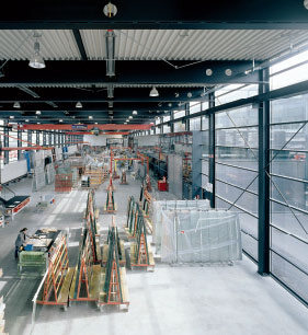 Liegende Fensterformate verleihen der Fassade einen ruhigen Charakter und unterstreichen die Länge der Halle. Im Innern ist alles, was dem Prinzip Tragen und Lasten entspricht und sich mit Schwere assoziieren lässt - die Stahlkonstruktion - in Schwarz gehalten, die leichteren Holzsheds im Dach als Lichtquelle in Weiß.