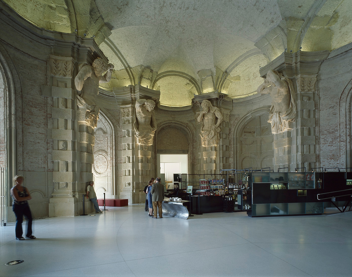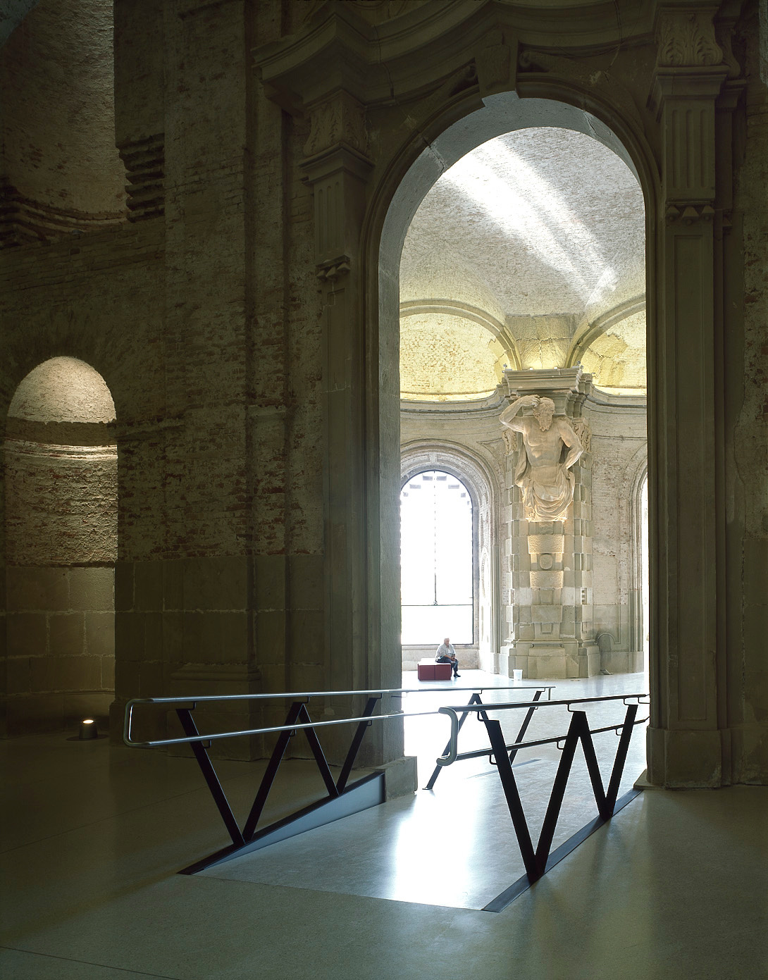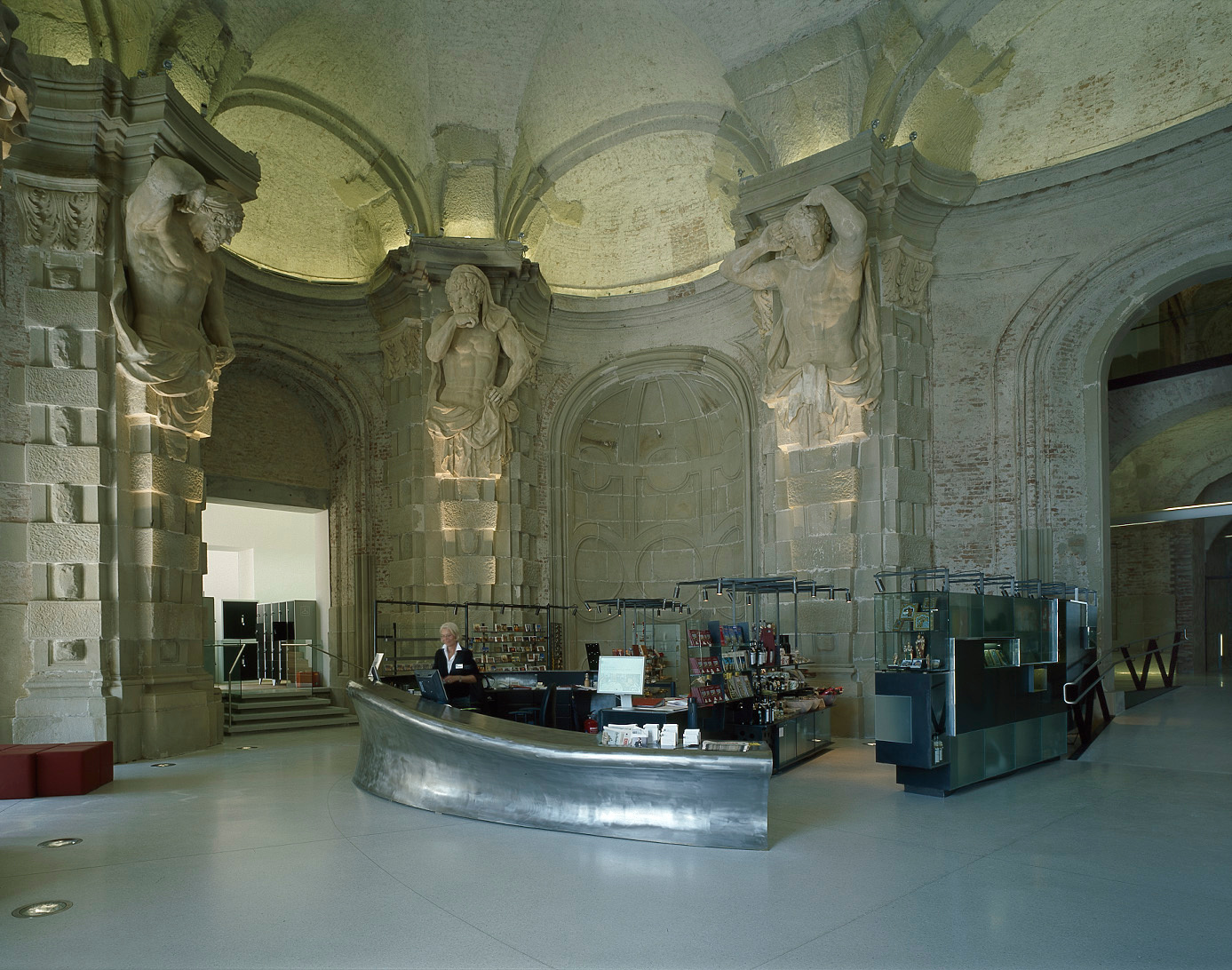 Das Licht geleitet die Besucher dabei. Verspiegelte Edelstahl-Lamellen in den neuen „Sala terrena“-Fenstern lenken es in den dahinterliegenden Saal, der ebenfalls von einer Zwischendecke befreit wurde. Von hier aus gehen die Besucher durch lange, durch Nischen strukturierte Gänge. Immer wieder lecken helle Sonnenstrahlen über die Gewölbe, dazwischen bleibt die Szenerie schummrig, und durch dieses Licht-Schatten-Spiel bekommen die Räume eine, man möchte fast sagen, spirituelle Qualität.
