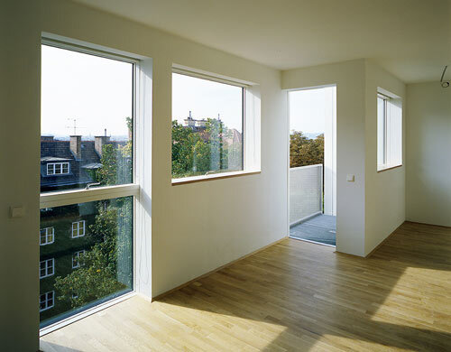 Mit dem Bestandsbau hat das Dachgeschoß wenig zu tun. Einmal ragt die autonome Struktur kühn in den Hof, ein anderes Mal fluchtet sie dezent zurück. „Wir wollten die Maisonetten wie Reihenhäuser aufs Dach stellen“, so Kunath, „jede Wohnung sollte viel Ausblick, Licht und auf jeder Ebene eine Terrasse oder einen Balkon haben.“