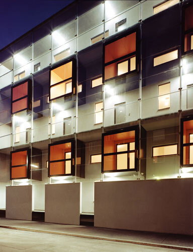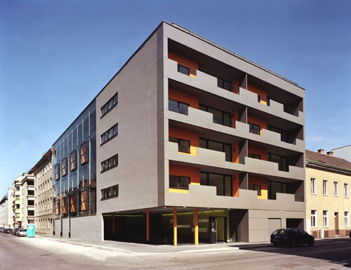 Auf der Straßenseite ums Eck dominieren verglaste Laubengänge das Erscheinungsbild des Hauses. In der geschuppten Fassade spiegelt sich die stille Bertlgasse. Geschützt von einem Wandsockel mit Lichtschlitzen erhebt sich das Erdgeschoß über die Straßenniederungen. Souverän gleiten die Glasstreifen in die Schuppenhaut darüber, wo orange Loggien vorwitzig aus der Glasebene ragen. Was man auf den Fotos noch nicht sieht: Schon wurden die Freiräume von den Mietern einverleibt: Erste Pflanzen und Wäschetrockner bereichern die orangen Loggien um lebendige Einsprengsel.