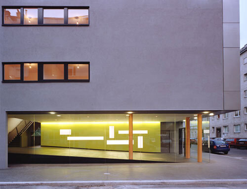 Das Haus scheint über dem eingeschnittenen Eingangsfoyer zu schweben. Orange Säulen halten es im Gleichgewicht, ein Metallrahmen fasst die Glastür, durch die man die Stiegenhaus-Bühne des Gemeinschaftslebens betritt. Nachts strahlt das gelbe Entree weit in die Umgebung hinaus, dann beginnen auch die weißen, gestanzten Streifen von innen heraus zu leuchten - ein freundlicher Auftakt zum Stiegensteigen. Neonröhrenflankierte Untersichten, reflektierende Metallbrüstungen, helle Gänge und Luftbrücken, die einen Vorplatz mit spannenden Perspektiven schaffen, führen die Bewohner zu ihren Wohnungstüren.