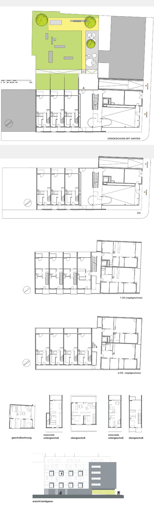 Die Grundrisse mit meist mittigem Sanitärkern sind sehr kompakt. Einmal sind sie eingeschoßig, einmal erweitern Maisonetten mit einläufiger Stiege das Wohnangebot zur Zweigeschoßigkeit. Immer wieder werden Durchblicke ans Tageslicht inszeniert. Nicht nur von den Wohnzimmern kann man ins Freie treten, auch so manches Schlafzimmer gewährt Austritt an die Luft. Im Erdgeschoß weiten sich die hofseitigen Terrassen sogar zu Mietergärten.