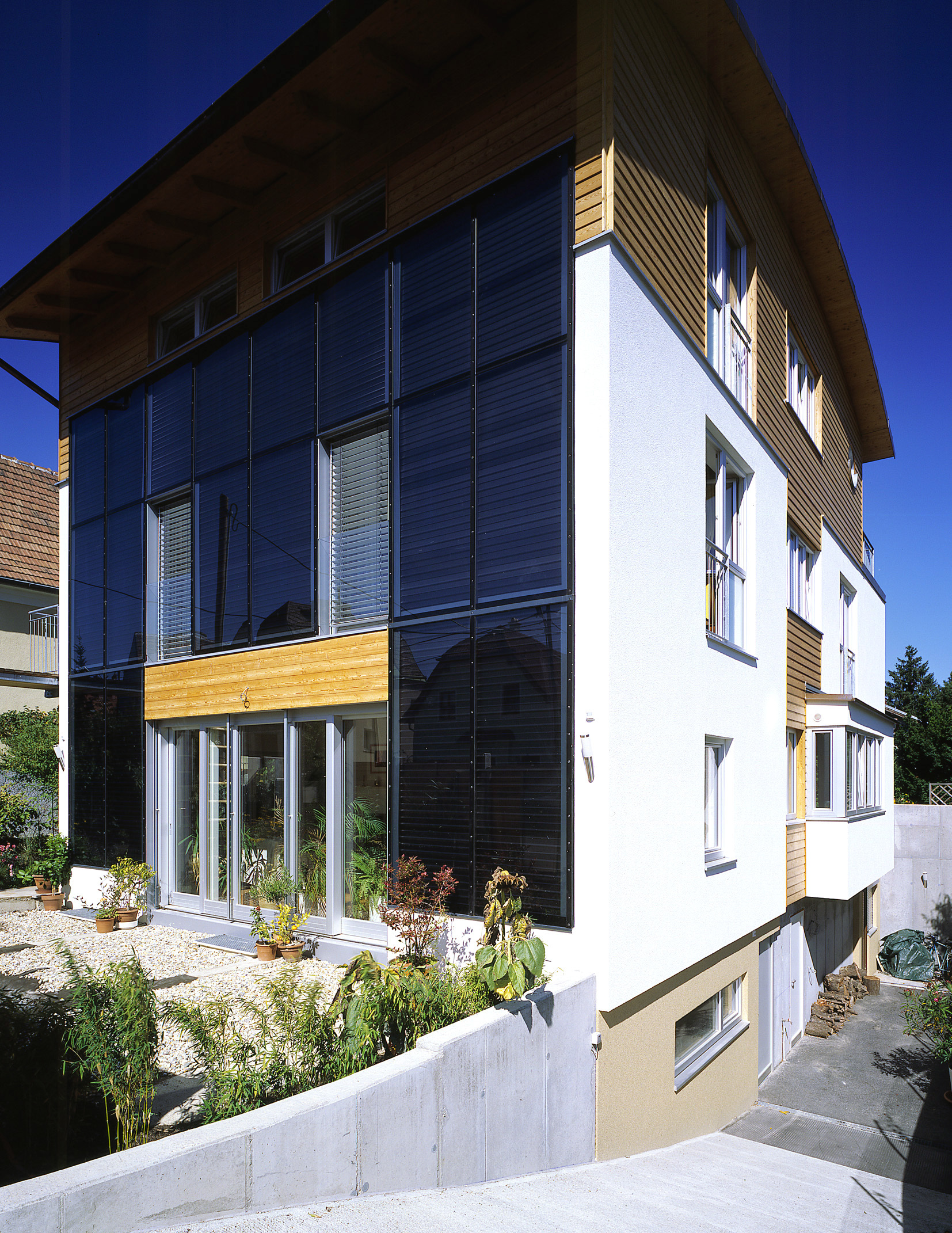 Lärchenlatten bieten Blickschutz zur Straße, dahinter grünt üppig ein Vorgarten mit Oleander, Schilf und Biotop. Die Terrasse im Süden wird zum verlängerten Wohnraum unter freiem Himmel. Als vornehmer Rahmen entwachsen dem weißen Mauersockel dunkle Solarpaneele. Sie nutzen die Gunst der Südlage, liefern der Fußbodenheizung die benötigte Energie und reflektieren Himmel und Erde. Sacht überwölbt ein Tonnendach die lärchenverkleidete Mansarde, die sich als eigene Einheit bewohnen lässt.