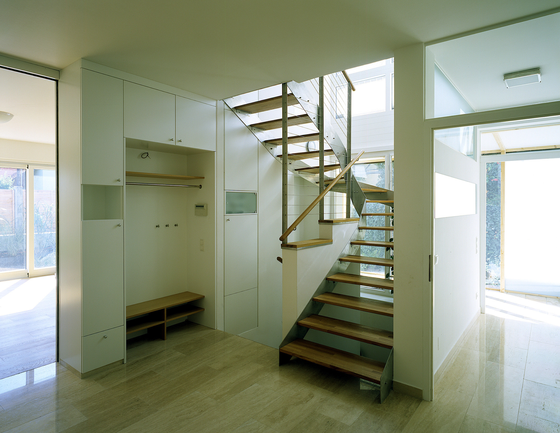 Man nähert sich dem Haus: Empfangen wird man von einem gläsernen Windfang. Die Ordination ist vom Vorraum aus getrennt zu betreten, eine andere Tür führt weiter in den Privatbereich. Die eigentliche Hausmitte ist leer, eine Wand mehr wird eines Tages das Teilbarkeitskriterium erfüllen – nun bereichert der Raum als offene Kommunikationszentrale, in die alle Türen münden, das Familienleben.