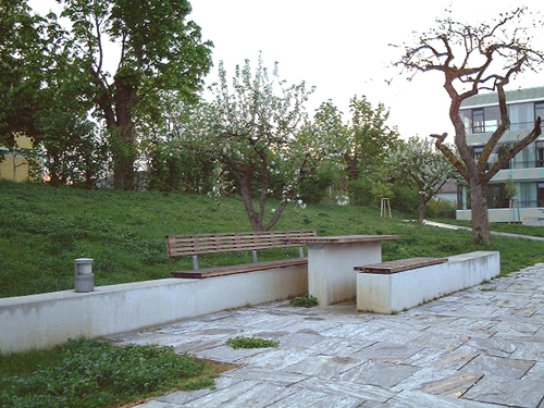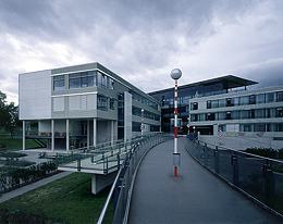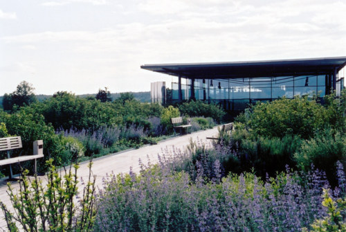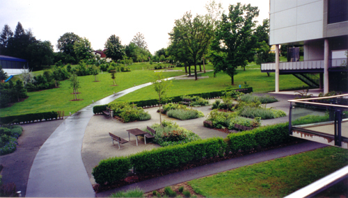 Ein weiterer Bettentrakt ist in Richtung Südosten, parallel zur Straße, so angeschlossen, dass der alte Obstgarten im Südwestteil als ruhiger, vom Verkehrslärm abgeschirmter Park erhalten blieb. In der Mitte der Anlage, wo sich die Funktionen und Volumina überschneiden, löst eine verglaste Halle den Knoten in Transparenz auf: hier treffen Innen-, Außenraum und alle Wege zusammen und verbinden sich zu einem offenen Zentrum der Verteilung, des Überblicks und der Erschließung.