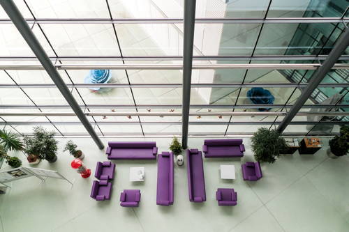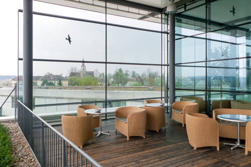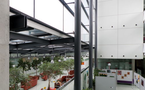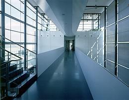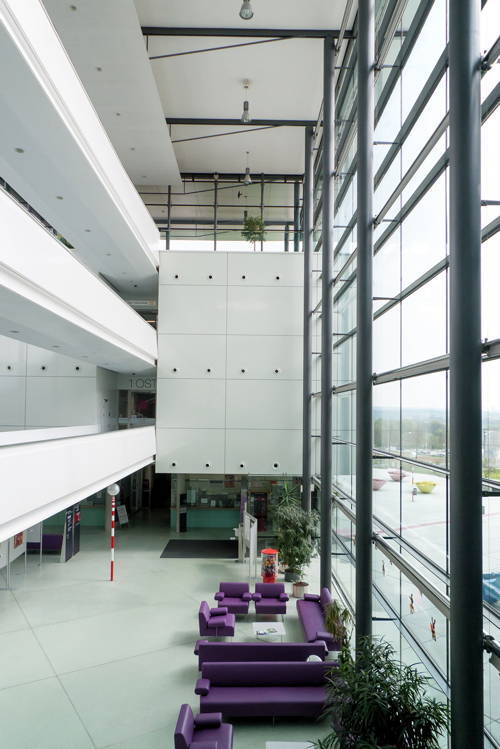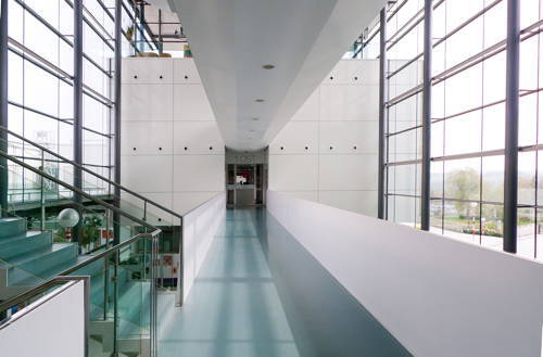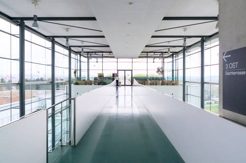 Eine minimierte Stahl-Glaskonstruktion umhüllt den vier Etagen hohen Luftraum, drei frei gespannte Brücken durchqueren ihn, erschlossen durch den gläsernen Besucherlift und die frei gestellte Stahltreppe vor dem statisch/optischen „Haltepunkt“ - dem Winkel der Sichtbetonwände an der Nordwestecke der Halle. Die oberste Brücke führt auf das Dach des östlichen Bettentraktes auf einen großzügigen Dachgarten, der als teilweise überdachtes Plateau hoch über Stadt und Landschaft schwebt.