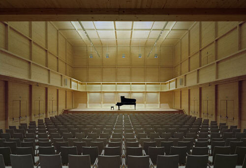 Das Herzstück des Gebäudes ist der Konzertsaal. Kein österreichischer Architekt hätte sich je getraut, sich an die Bauaufgabe in solch hölzernen Schritten heranzuwagen. Was die Architekten aufgrund der klassischen Proportionen als „Schuhdose“ bezeichnen, entfacht beim Besucher den Eindruck, als stünde man im überdimensionalen Resonanzkörper eines Cellos oder eines Klaviers - oder mitten in einer hochalpinen Zirbenstube. Ist das regionale Architektur?