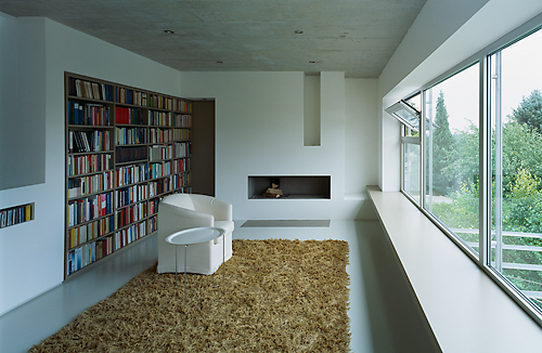 Als weiße Zeile duckt sich die Küche an die Westwand. Die Bar auf Rollen ist so flexibel wie die Bänke am ausziehbaren Tisch. Einen Stock darüber wartet das Kaminzimmer mit stoischer Stimmung auf, nahtlos geht der gemauerte Ofen an der Wand in die Bibliothek über. Mit mehr Höhe und Licht wechselt die Stiege ihr Material. In leichtem Stahl gleitet sie zum Spielflur hoch, von wo aus die gleich großen Schlafzimmer für Eltern und Kind zu betreten sind. Eine gläserne Dusche nutzt das Gangende kurz vorm Bad, durch das Glas fällt Licht in den Gang. Das letzte Treppenstück führt dann hinauf auf die Terrasse, wo man sich im Angesicht des Gartens unter freiem Himmel sonnen kann.