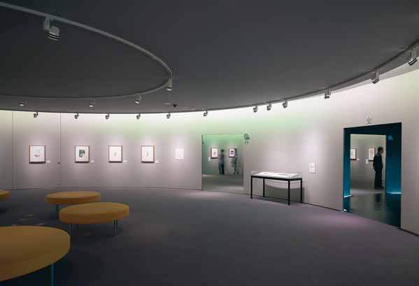 Fußböden und Deckenuntersichten sind geringfügig dunkler gehalten und rahmen damit die helleren, beleuchteten Wandflächen zu einem fortlaufenden Kontinuum, das durch die bleistiftdünnen Laibungen der Raumverbindungen visuell kaum unterbrochen wird. Von den zentral platzierten Sitzarrangements lassen sich die Bildfolgen wie eine Banderole betrachten, die in den angrenzenden Räumen mäanderförmig fortzulaufen scheint. Auch wenn sich beim Gang durch die Ausstellung gelegentlich die Übersicht verliert, die Qualität des fließenden Raumes durch zeitgleichen Einblick in unterschiedliche Räume und Abläufe fasziniert.