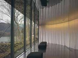 Die Lounge mit ihren sparsam aufgestellten Fauteuils ist – wie das Café – einer der wenigen Publikumsräume mit direktem Außenbezug. Ihr mit Spiegelflächen verkleidetes Halbrund hüllt den Besucher in ein abstrahiertes Vexierbild der spektakulären Außenkulisse. Warum der von der Ausrichtung des Gebäudes wohl attraktivste Bereich nach Süd-Osten mit Blick auf die eindrucksvolle Bergkulisse den Technikräumen vorbehalten ist, bleibt unverständlich. Auch scheint das von außen mit rosafarbenem Marmor kaschierte Zwangskonstrukt des Halbkreises denkbar schlecht geeignet für die Unterbringung der Haustechnik; das Gleiche gilt für das in einer anderen Ecke des Museums untergebrachte Bildarchiv. An den gut besuchten Wochenenden, wenn im steten Zufluss Busse aus den Täler quellen, erweist sich die runde Form gelegentlich als wahrer Schalltrichter, der den akustischen Grundpegel auf unangenehme Stärke anhebt. Die Ausstellungsräume selbst oszillieren in antiquierten Pastelltönen und korrespondieren damit weder mit Tomihiros leuchtender Farbskala noch mit der formalen Hülle der Räume.