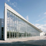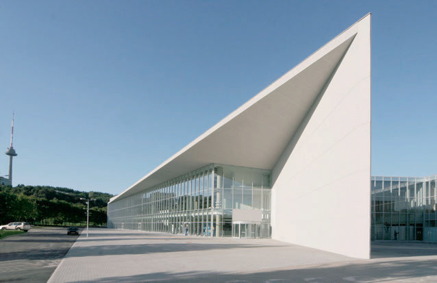 The inner space of the pavilion faithfully echoes the exterior’s crystalline, structural appeal. The 12-metre-high, 2000-seat conference hall space was designed for adaptability from the very start. All service areas are hidden in low-rise volumes outside the almost windowless rectilinear walls, thus maximizing the usable internal space. These external projections house a cafeteria with outdoor terrace, a 200-seat conference hall, staff rooms, cloakrooms, rest rooms as well as vertical and horizontal circulation. There is a technical basement underneath the entire structure.